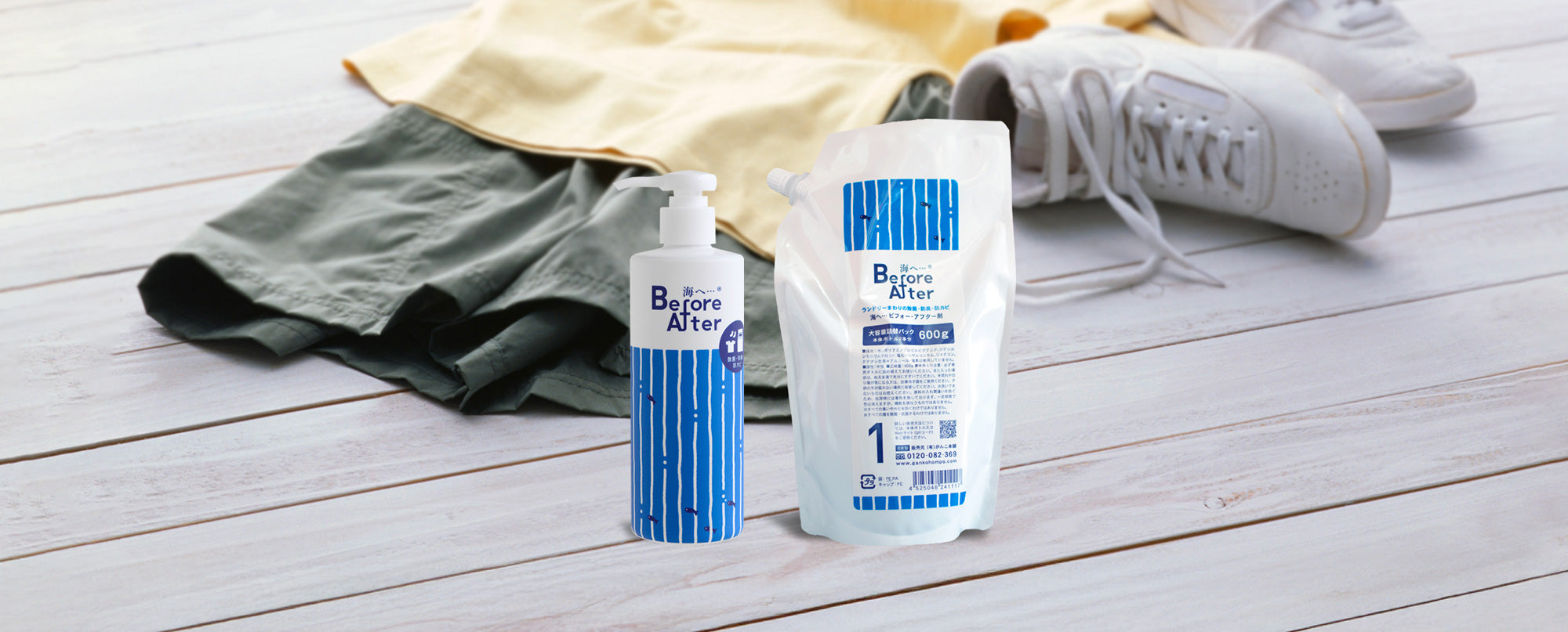 「海へ…ビフォー・アフター剤」は衣類の菌の繁殖をビフォーに使用することで防ぎ、アフターとして洗濯機に使用することで洗濯槽の防カビを実現する「予防」「防衛」商品。